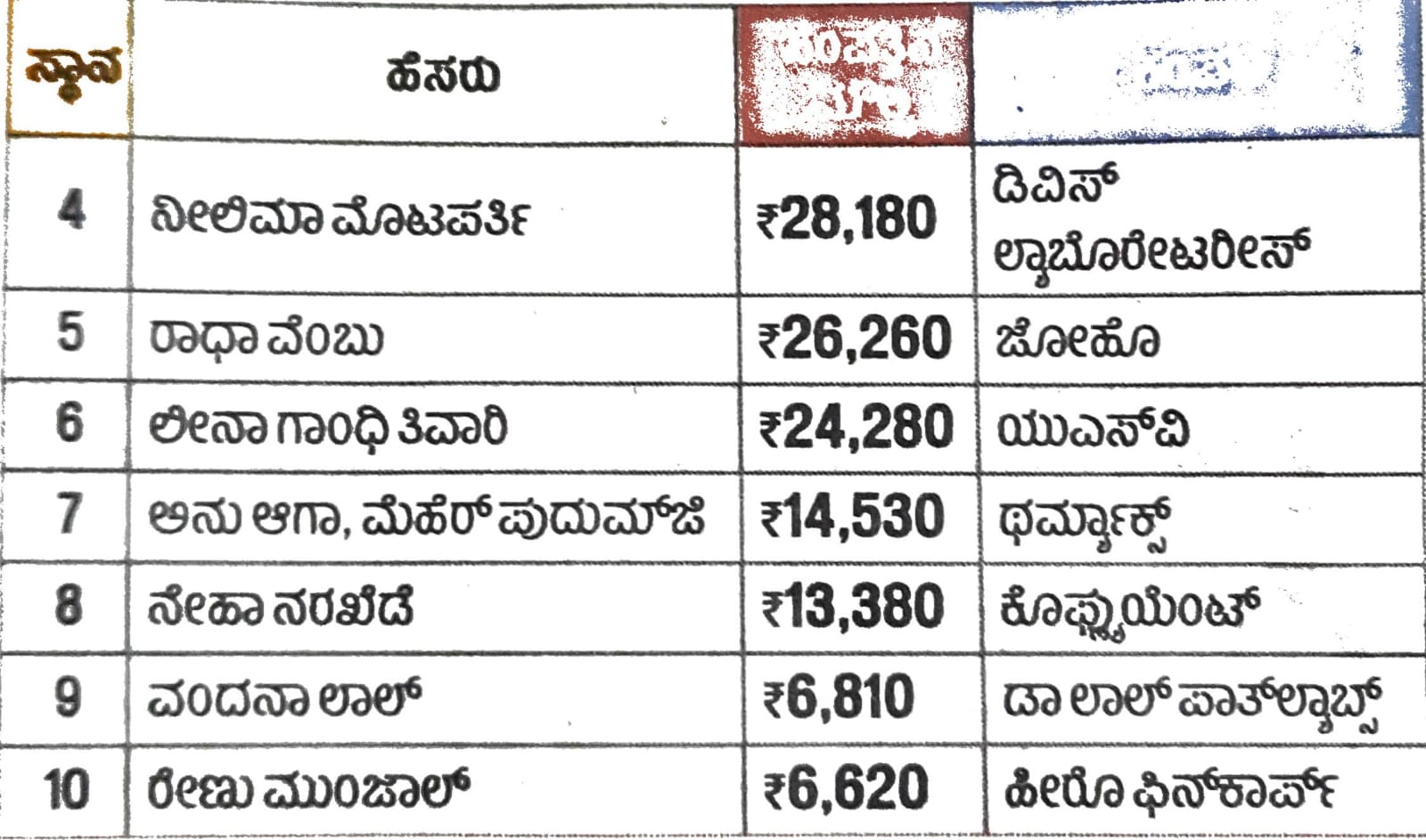 * ಎರಡು ಮತ್ತು ಮೂರನೆಯ ಸ್ಥಾನಗಳಲ್ಲಿ ಕ್ರಮವಾಗಿ ನೈಕಾ ಕಂಪನಿಯ ಸಿಇಒ ಫಲ್ಗುಣಿ ನಾಯರ್ ಮತ್ತು ಕುಟುಂಬ(ಮೌಲ್ಯ Rs. 57,520) ಹಾಗೂ ಬಯೋಕಾನ್ ಅಧ್ಯಕ್ಷೆ ಕಿರಣ್ ಮಂಜುದಾರ್ ಶಾ(ಮೌಲ್ಯ Rs. 29,030) ಇದ್ದಾರೆ.
